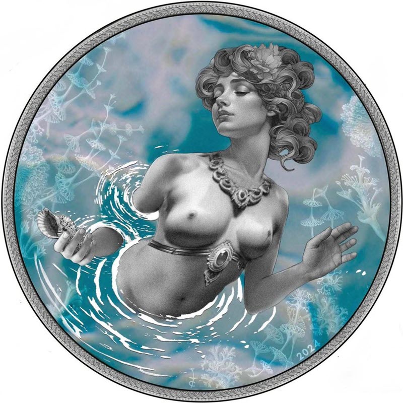 На реверсе изображена Афродита на фоне водных элементов и замысловатых узоров. Справа внизу: 2024 (год чеканки).