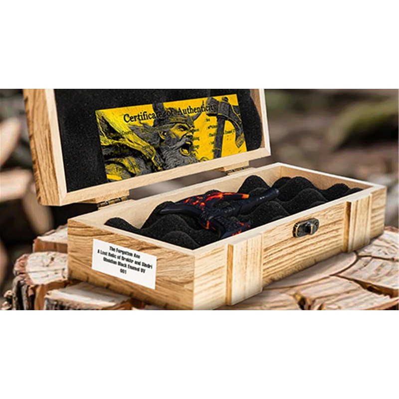 Эта прекрасная серебряная монета весом в 2 унции посвящена боевому топору. У нее размеры 46 Х 85 мм, качество античной отделки, черный обсидиан и селективное УФ-свечение. Поставляется в оригинальном футляре с сертификатом подлинности. Тираж: 349 штук.