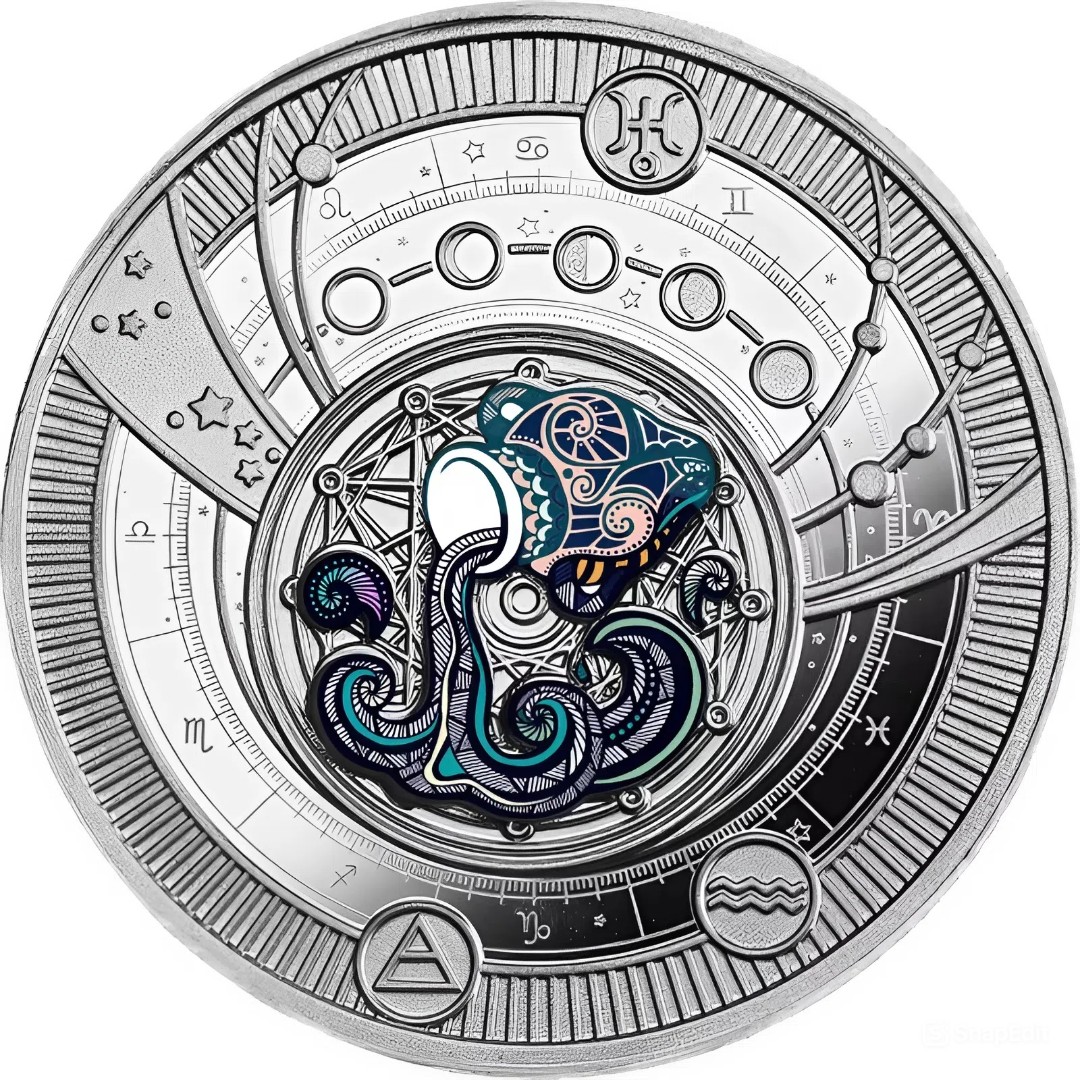 Эта потрясающая серебряная монета-подвеска с цепочкой посвящена одиннадцатому астрологическому знаку зодиака - “Водолей” (Aquarius). Считается, что к нему принадлежат рождённые с 21 января по 20 февраля. Водолеи — представители воздушной стихии, известные своим новаторским взглядом на жизнь. Мечтательность и идеализм в них сочетаются с целеустремленностью и независимостью.