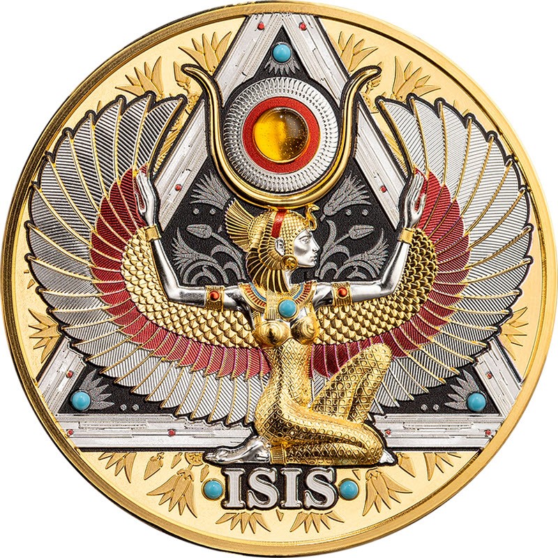На реверсе изображена Исида с широко расправленными крыльями, украшенная короной с солнечным диском и рогами, олицетворяющей силу и божественность. Композицию добавляют вставки из янтаря и бирюзы. Внизу надпись: ISIS.