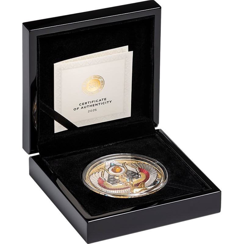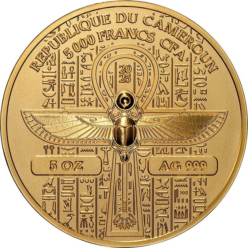 На аверсе в центре изображен жук-скарабей с крыльями (символ возрождения и обновления) на фоне египетских иероглифов. Вверху надпись: REPUBLIQUE DU CAMEROUN 5000 FRANCS CFA 2025 (страна-эмитент, номинал, год чеканки), под крыльями жука: 5 OZ Ag 999 (вес и проба серебра). На гурте индивидуальный номер монеты.