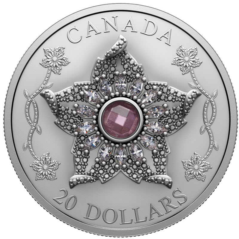 Серебряная монета от Канадского монетного двора весом в 1 унцию – вторая из серии Crown Jewels (Драгоценности короны). У неё качество пруф, кристаллы вставлены в родиевую оправу. Поставляется в элегантном футляре с сертификатом подлинности. Тираж: 6000 штук.