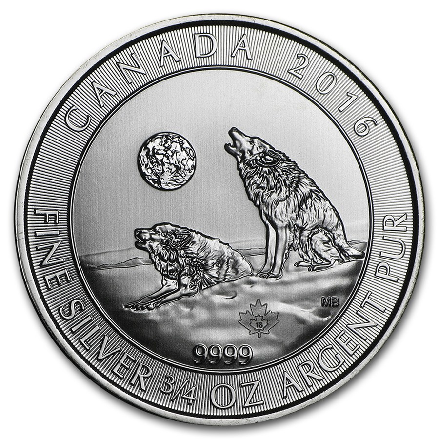 На реверсе во внутреннем круге изображены два воющих волка на фоне Луны; внизу под ними помещен тайный знак монетного двора и проба драгоценного металла в монете – «9999». По ободу кругом стоят надписи: «FINE SILVER ¾ OZ ARGENT PUR CANADA 2016» (на английском и французском языках: чистое серебро весом в ¾ унции; страна-эмитент – Канада, год выпуска - 2016).