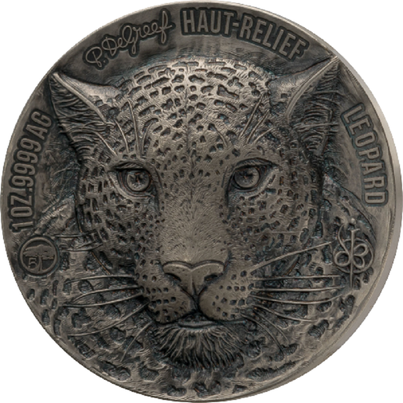 На реверсе монеты изображено красивое и детальное изображение морды леопарда, выполненное в высоком рельефе. Вверху реверса надписи: "HAUT-RELIEF", "LEOPARD" и "1 OZ .9999 AG".
