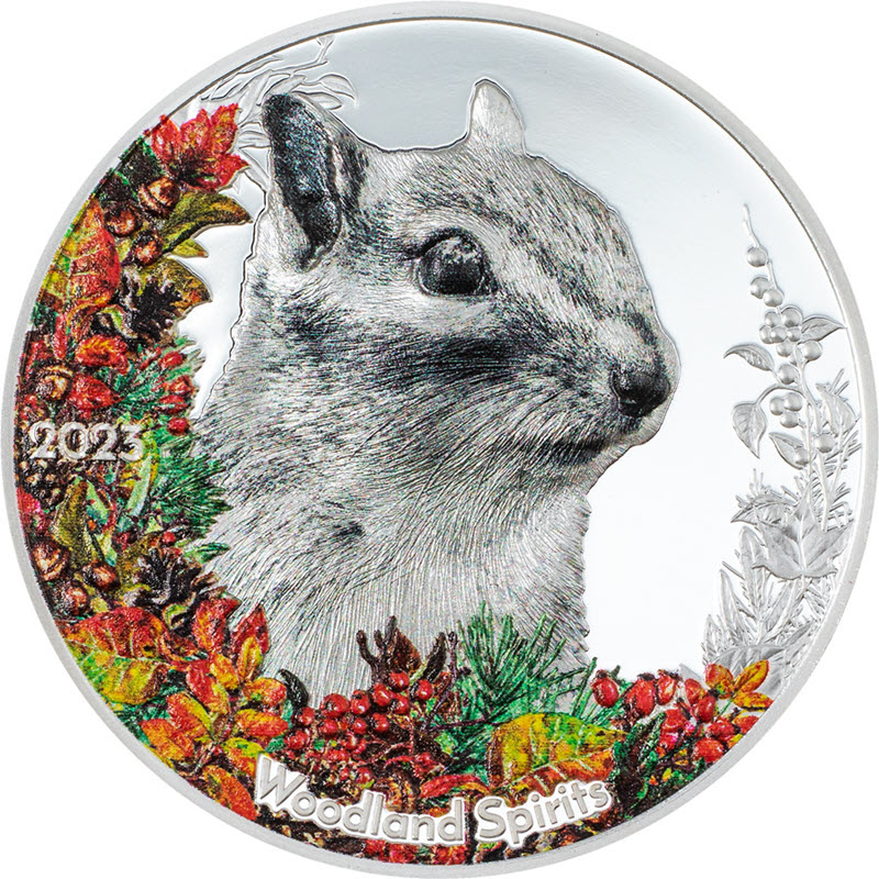 На реверсе изображен бурундук среди осенних листьев и фруктов. Слева надпись: 2023 (год чеканки), внизу: Woodland Spirits (серия).