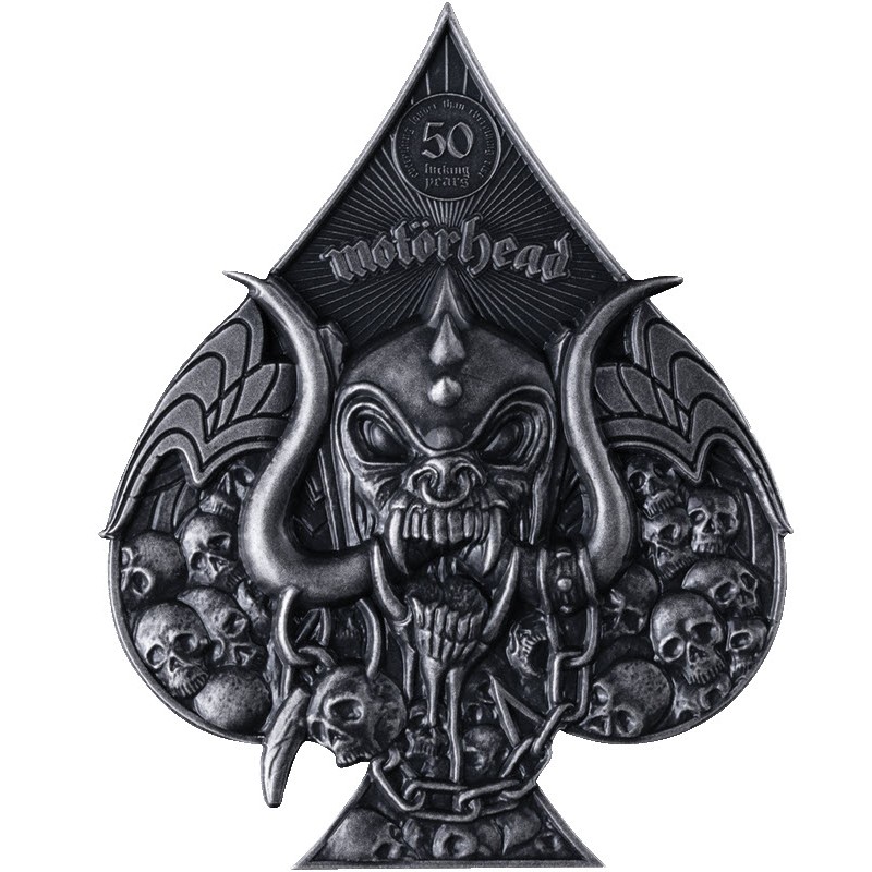Эта чудесная серебряная монета весом в 3 унции от немецкого монетного двора MDM посвящена 50-летию группы «Моторхед». У нее форма пиковой масти размером 60 х 46 мм, качество античной отделки и ультра высокий рельеф. В комплект входит брелок, посвященный группе. Поставляется в оригинальном футляре с сертификатом подлинности. Тираж: 699 штук.
