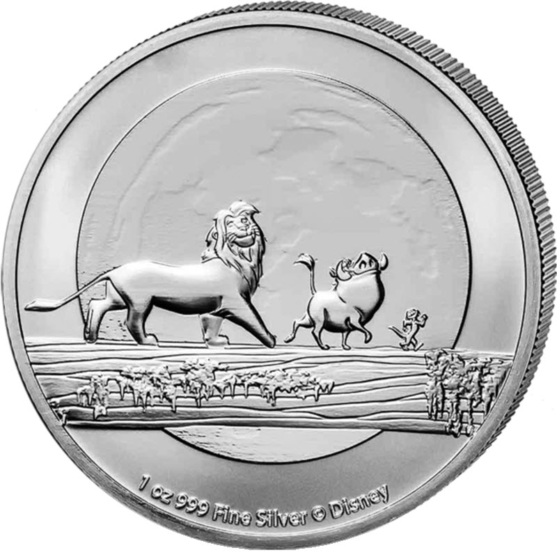 Эта серебряная монета весом в 1 унцию посвящена Симбе и его друзьям Пумбе и Тимону из мультфильма «Король Лев». У нее качество БА. Тираж: 25000 штук.