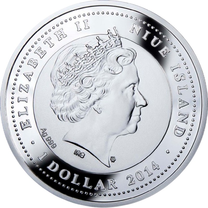 В центре - портрет Ее Величества Королевы Елизаветы II дизайнера Яна Рэнка-Бродли (IRB). Слева внизу – 999 (проба серебра), справа внизу– m/w – монограмма Польского монетного двора. Вдоль канта надписи: ∙ ELIZABETH II NIUE ISLAND ∙ 1 DOLLAR 2014 ∙ (Елизавета II, страна-эмитент, номинал, год чеканки).