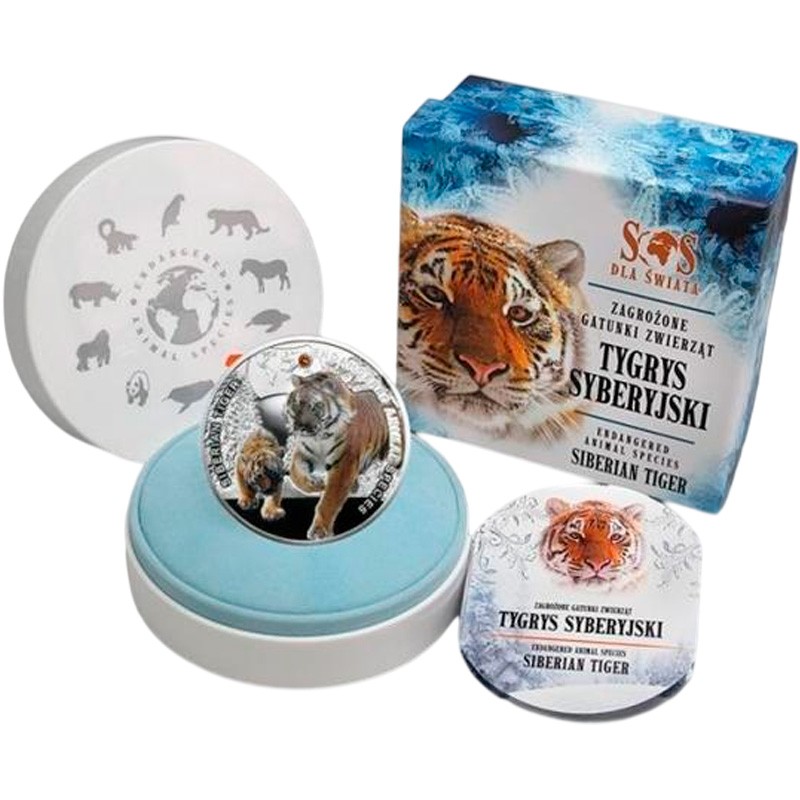 Эта чудесная серебряная монета Польского монетного двора из серии «Исчезающие виды животных» (Endangered Animal Species) посвящена Амурскому тигру.