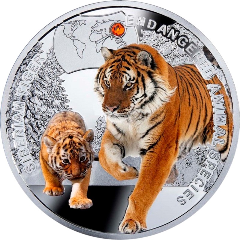 В центре - цветное изображение взрослого тигра с тигренком на фоне заснеженного леса. Вверху - карта мира с оранжевым кристаллом, указывающим на ареал обитания вида. Вдоль канта по кругу надписи: SIBERIAN TIGER ENDANGERED ANIMAL SPECIES (Амурский тигр, название серии).