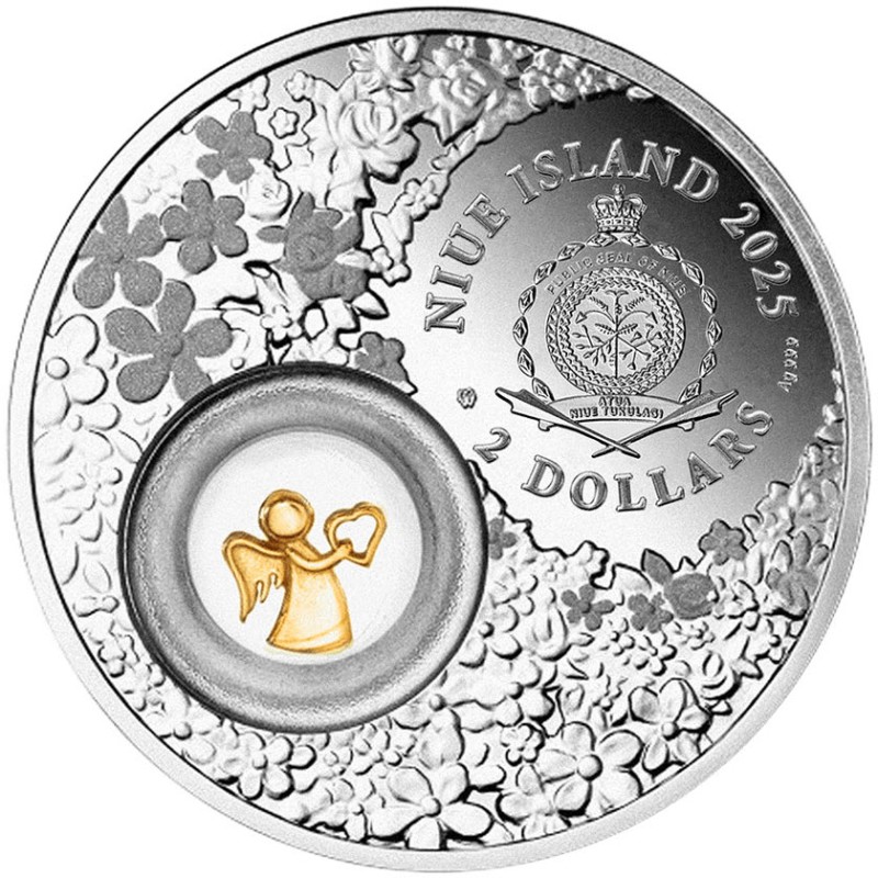 На аверсе на фоне цветов изображен герб Ниуэ. Вокруг герба надпись: NIUE ISLAND 2025 mw 2 DOLLARS Ag 999 (страна-эмитент, год чеканки, монограмма польского монетного двора, номинал, проба серебра). Слева прозрачная капсула с филигранным ангелом из 24-каратного золота.