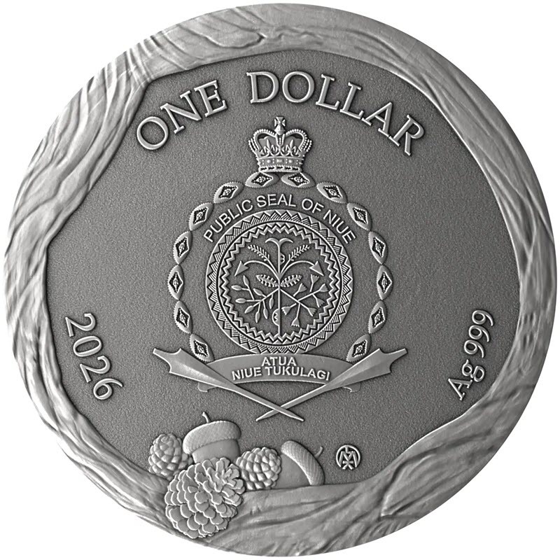 На аверсе монеты изображена неофициальная «Государственная печать Ниуэ». Это композиция из растений в центре внутри двойного декоративного круга, окруженного морскими раковинами. Он увенчан короной Святого Эдуарда (символом Соединенного Королевства, монарх которого в конечном итоге является главой государства Ниуэ). Сверху между ними надпись PUBLIC SEAL OF NIUE. Ниже на ленте в две строки изображен девиз ATUA NIUE TUKULAGI, ниже которых две перекрещенные катуа. Вдоль канта надпись: ONE DOLLAR 2026 LM Ag 999 (номинал, год чеканки, монограмма литовского монетного двора, проба серебра).