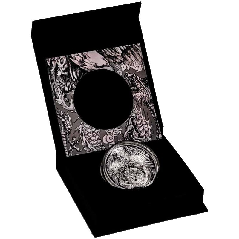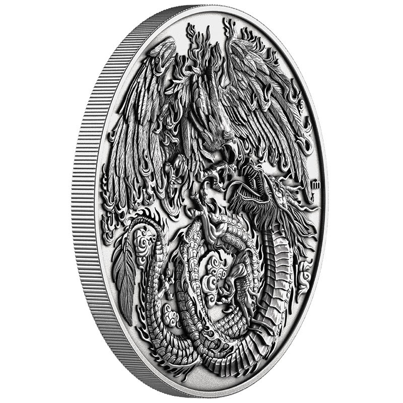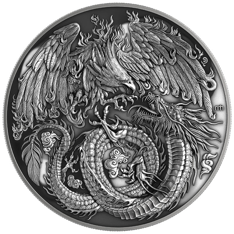 Эта удивительная серебряная монета весом в 2 унции посвящена фениксу и дракону. У нее качество пруф и ультравысокий рельеф. Поставляется в оригинальном футляре с сертификатом подлинности. Тираж: 222 штуки.