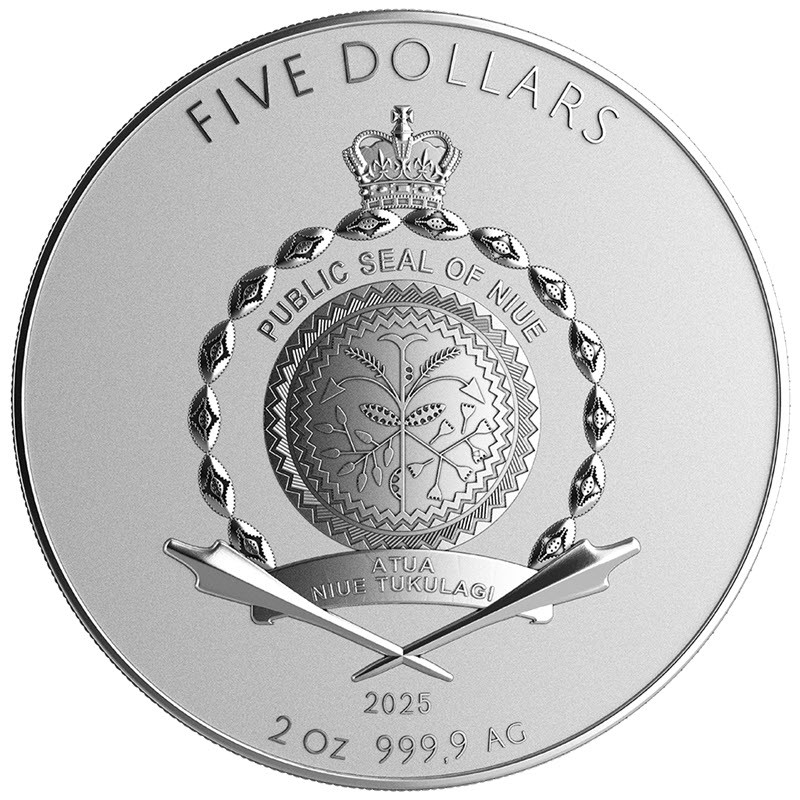 На аверсе на щите изображена неофициальная «Государственная печать Ниуэ». Это композиция из растений в центре внутри двойного декоративного круга, окруженного морскими раковинами. Он увенчан короной Святого Эдуарда (символом Соединенного Королевства, монарх которого в конечном итоге является главой государства Ниуэ). Сверху между ними надпись PUBLIC SEAL OF NIUE. Ниже на ленте в две строки изображен девиз ATUA NIUE TUKULAGI, ниже которых две перекрещенные катуа. Вдоль канта надпись: FIVE DOLLARS 2025 2 OZ 999.9 AG (номинал, год чеканки, вес и проба серебра).
