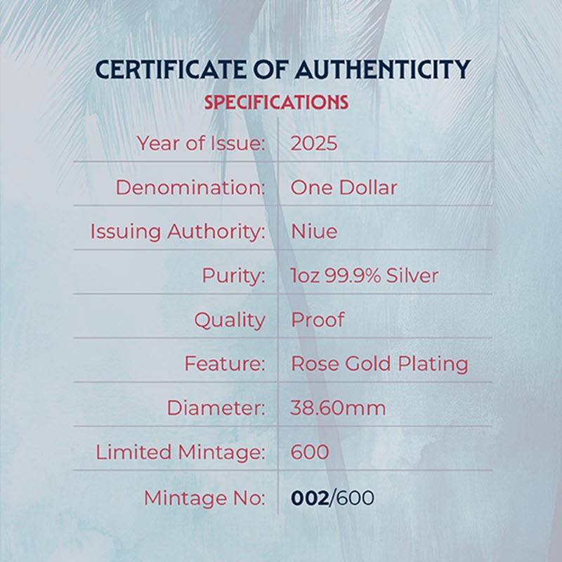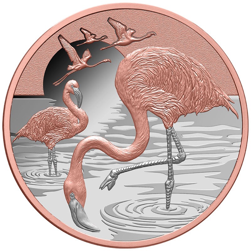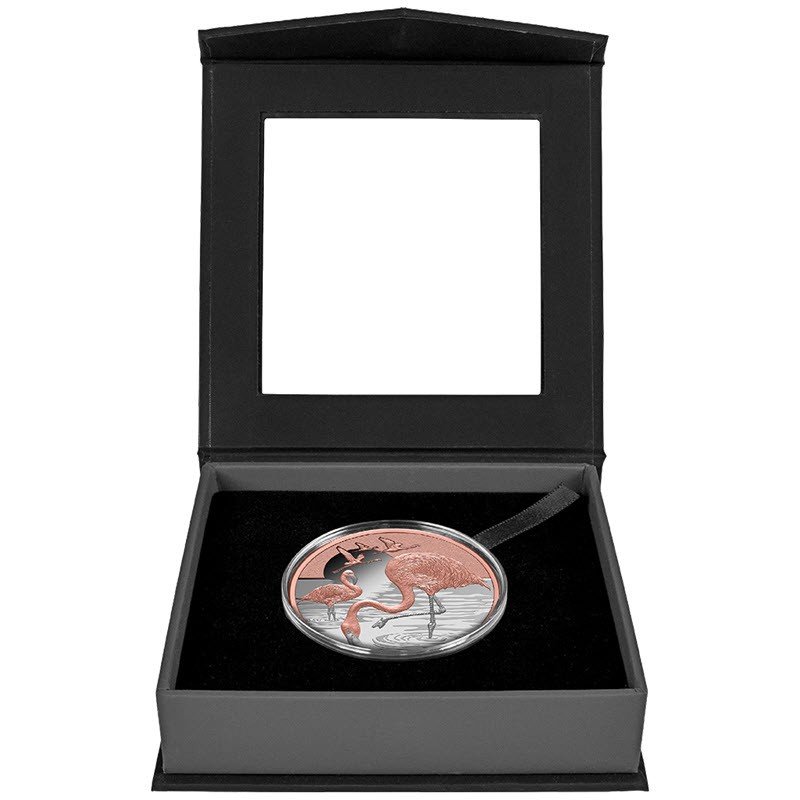 Эта чудесная серебряная монета весом в 1 унцию посвящена фламинго. У нее качество пруф и выборочное розовое золочение. Поставляется в оригинальном футляре с сертификатом подлинности. Тираж: 600 штук.