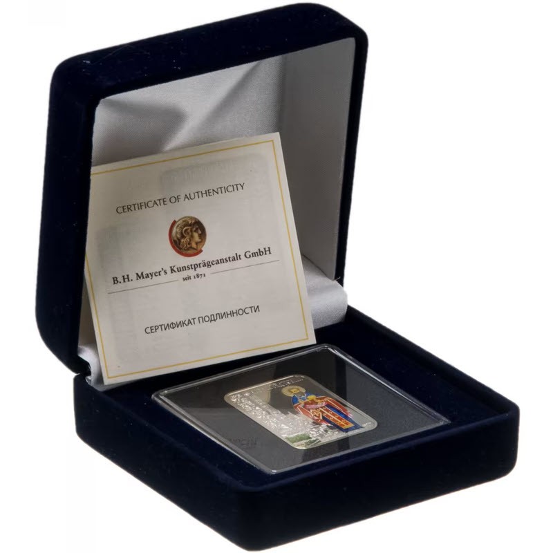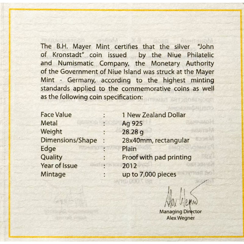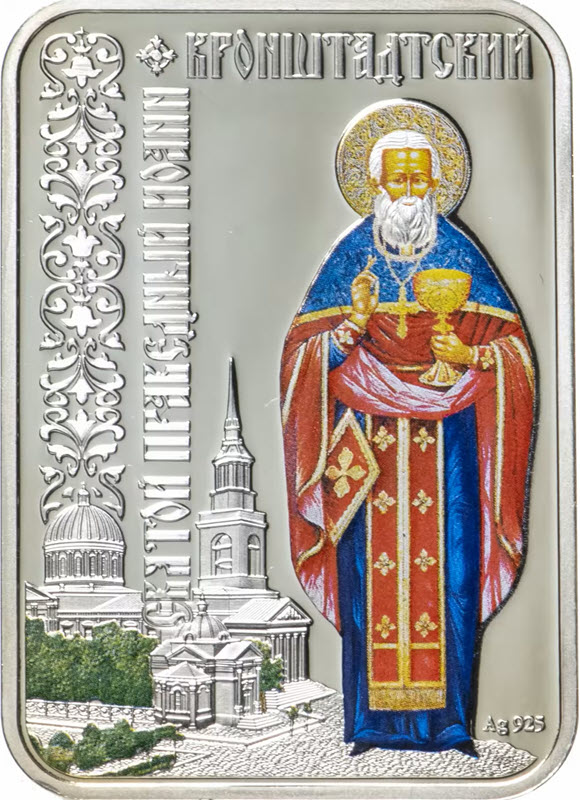 Эта памятная серебряная монета Ниуэ посвящена Иоанну Кронштадтскому. У нее размеры 28 х 40 мм, качество пруф и селективная окраска. Поставляется в оригинальном футляре с  сертификатом подлинности. Тираж: 7000 штук.