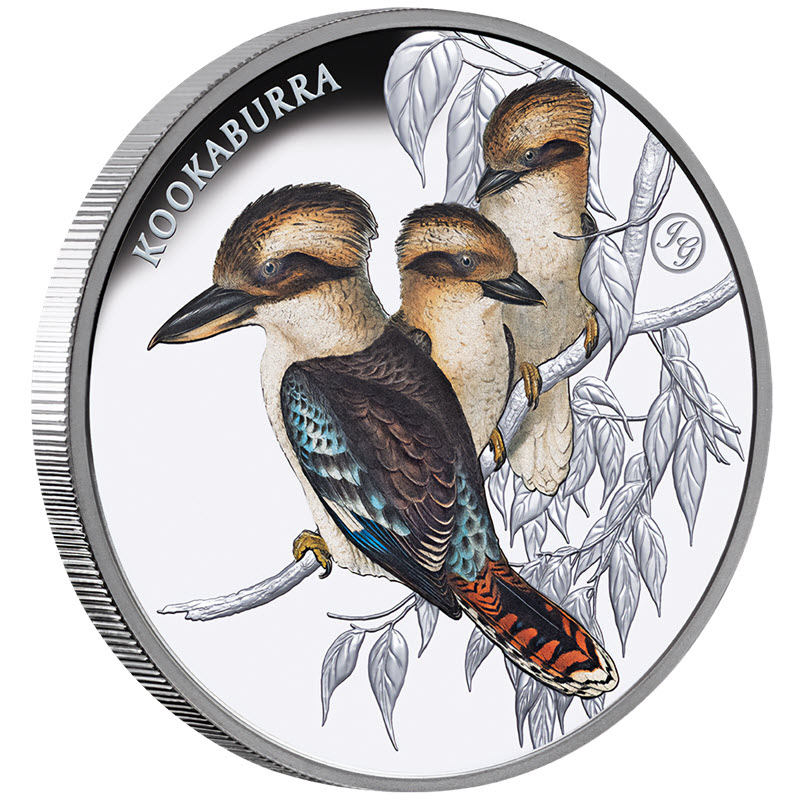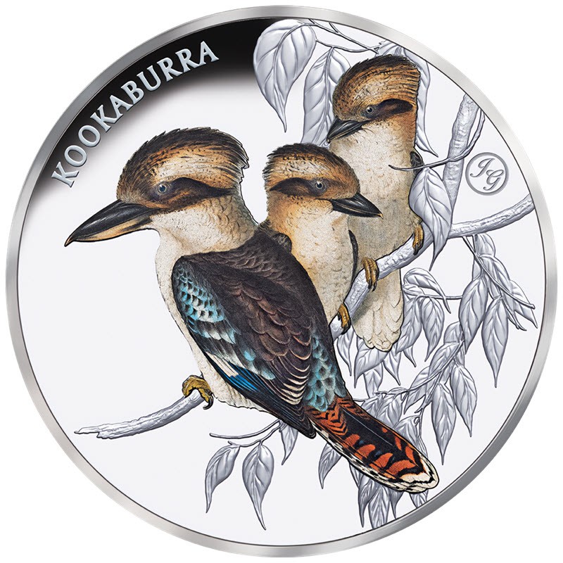 На реверсе изображение трёх кукабарр по рисункам британского орнитолога и художника-анималиста Джона Гульда. Вверху надпись: KOOKABURRA (кукабарра), справа клеймо: JG, созданное в честь Джона Гульда (John Gould).