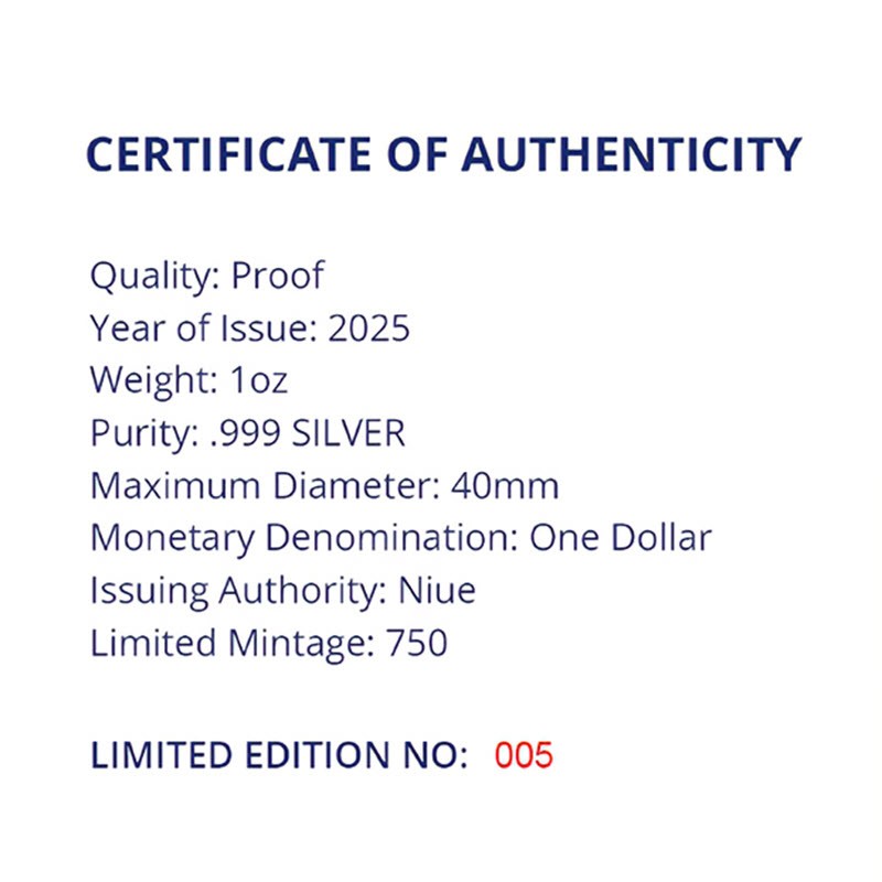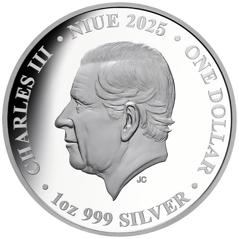 На аверсе изображен Его величество Король Чарльз III. Под шеей инициалы дизайнера JC (Jody Clark). Вдоль канта надписи: CHARLES III · NIUE 2025 · ONE DOLLAR · 1oz 999 SILVER · (Чарльз III, страна-эмитент, год чеканки, номинал, вес и проба серебра).