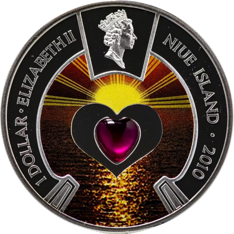 На фоне восходящего солнца – символ любви – сердце с вставкой из красного циркона. Вдоль канта надпись: 1 DOLLAR ∙ ELIZABETH II NIUE ISLAND ∙ 2010 (номинал, Елизавета II, страна-эмитент, год чеканки). Вверху – портрет Ее Величества Королевы Елизаветы II работы Маклауфа.