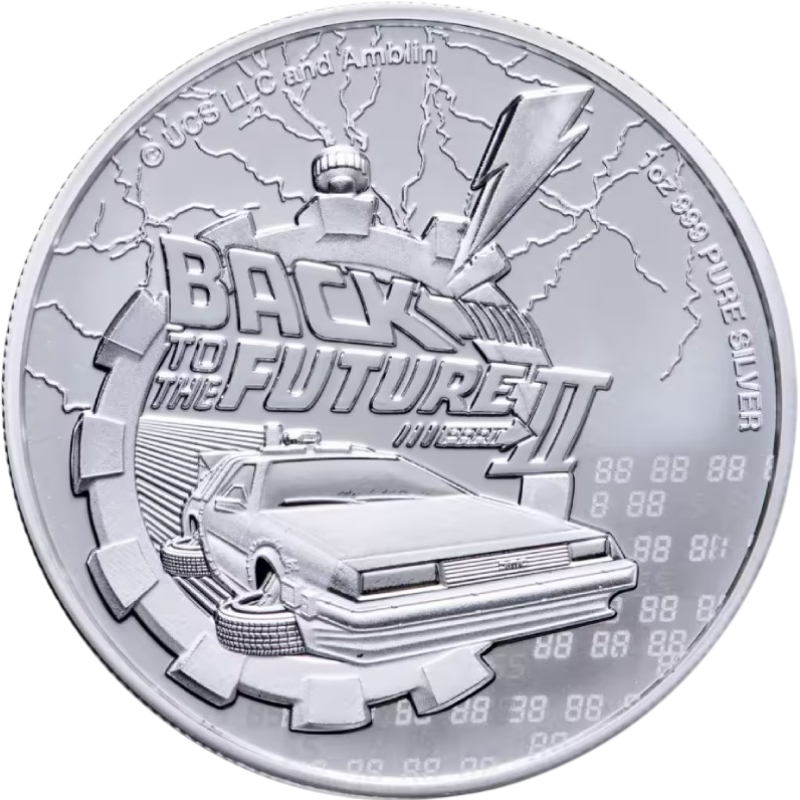 Эта чудесная 1 унцовая серебряная монета посвящена второму фильму трилогии «Back to the Future» («Назад в будущее») - классике научной фантастики о путешествиях во времени безумного учёного доктора Эмметта «Дока» Брауна и молодого Марти Макфлая.