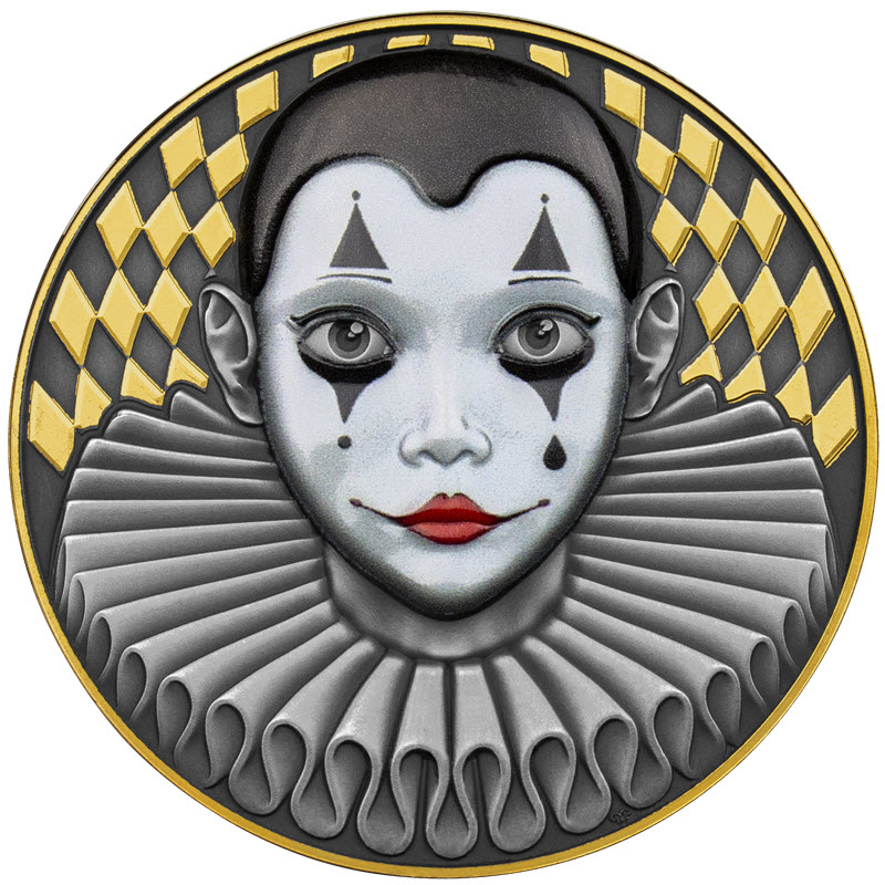 Эта чудесная серебряная монета в 2 унции посвящена Пьерро – персонажу французской пантомимы. У нее качество античной отделки, селективная окраска и выборочное золочение. Поставляется в оригинальном футляре с сертификатом подлинности. Тираж: 500 штук.