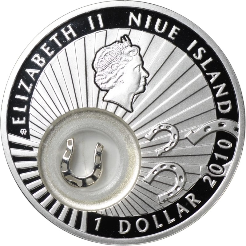 Главная особенность монеты — прозрачная капсула в левой нижней части, внутри которой находится подвижная миниатюрная серебряная подкова. Рядом с капсулой изображения подков. На фоне расходящихся от капсулы лучей - портрет Ее Величества Королевы Елизаветы II. Вдоль канта надписи: m/w ELIZABETH II  NIUE ISLAND  2010  1 DOLLAR (знак Польского монетного двора, Елизавета II, страна-эмитент, год чеканки, номинал).