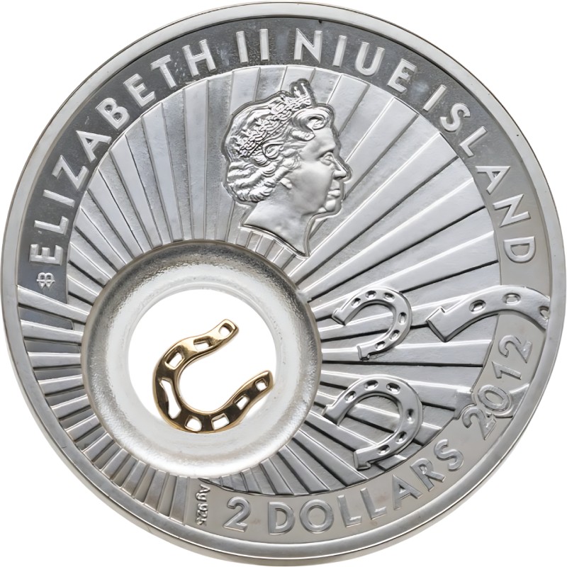 Главная особенность монеты — прозрачная капсула в левой нижней части, внутри которой находится подвижная миниатюрная серебряная подкова, позолоченная 24-каратным золотом. Рядом с капсулой изображения подков. На фоне расходящихся от капсулы лучей - портрет Ее Величества Королевы Елизаветы II. Вдоль канта надписи: m/w ELIZABETH II  NIUE ISLAND  2012  2 DOLLARS Ag 925 (знак Польского монетного двора, Елизавета II, страна-эмитент, год чеканки, номинал, проба серебра).