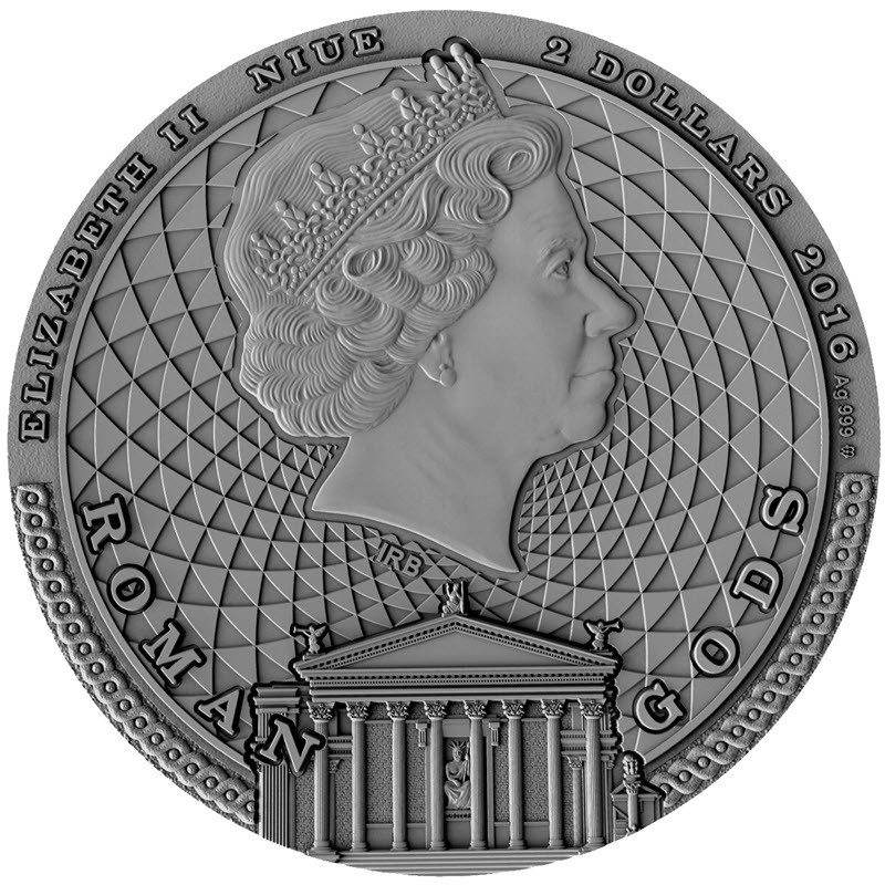 На аверсе изображена королева Елизавета II в бриллиантовой тиаре. Под портретом королевы инициалы дизайнера IRB (Ian Rank Broadley). Вверху вдоль канта надпись: ELIZABETH II NIUE 2 DOLLARS 2016 Ag 999 mw (Елизавета II, страна-эмитент, номинал, год чеканки, проба серебра, монограмма польского монетного двора), внизу капитолийский храм разделяет надпись: ROMAN GODS (Римские боги).