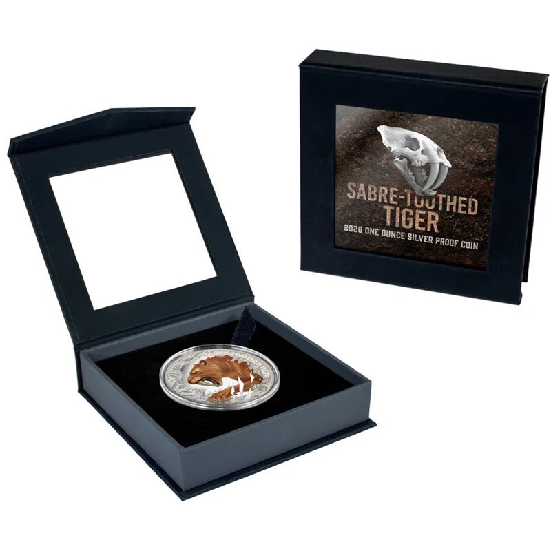 Эта чудесная серебряная монета весом 1 унция посвящена саблезубому тигру. У нее качество пруф и селективная окраска. Поставляется в оригинальном футляре с сертификатом подлинности. Тираж: 650 штук.