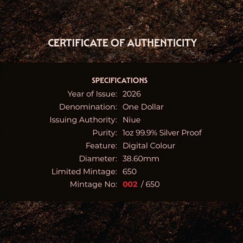 Серебряная монета Ниуэ "Саблезубый тигр" 2026 г.в. (пруф с цветом), 31.1 г чистого серебра (проба 999)