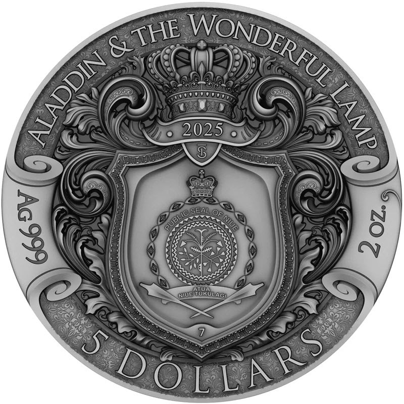 На аверсе на щите изображена неофициальная «Государственная печать Ниуэ». Это  композиция из растений в центре внутри двойного декоративного круга, окруженного морскими раковинами. Он увенчан короной Святого Эдуарда (символом Соединенного Королевства, монарх которого в конечном итоге является главой государства Ниуэ). Сверху между ними надпись PUBLIC SEAL OF NIUE. Ниже на ленте в две строки изображен девиз ATUA NIUE TUKULAGI, ниже которых две перекрещенные катуа. Над щитом надпись: • 2025 • TS (год чеканки, монограмма монетного двора), под щитом: 7. Вдоль канта надпись: ALADDIN & THE WONDERFUL LAMP Ag 999 5 DOLLARS 2 oz. (название монеты, вес и проба серебра, номинал).