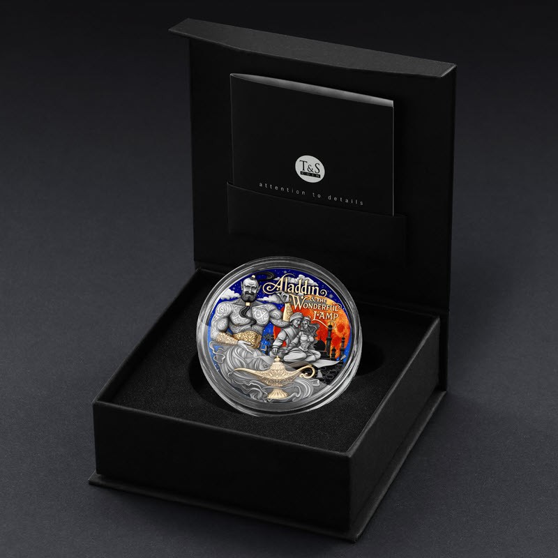 Эта удивительная серебряная монета весом в 2 унции от литовского монетного двора T&S Coin посвящена Аладдину. У нее качество античной отделки, высокий рельеф, выборочное золочение и селективная окраска. Поставляется в оригинальном футляре с сертификатом подлинности. Тираж: 500 штук.