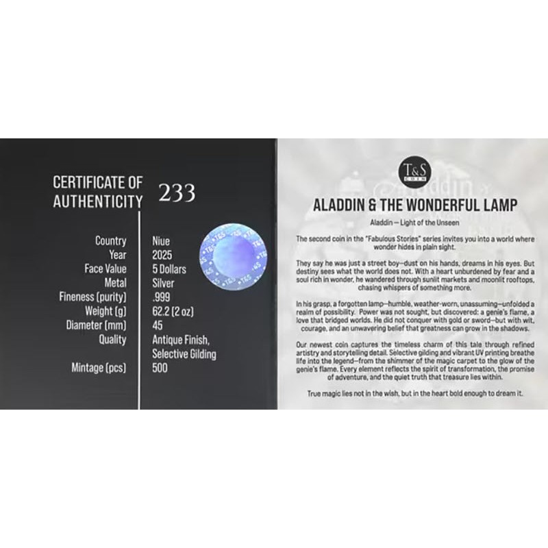 Серебряная монета Ниуэ " Сказочные истории. Аладдин и волшебная лампа" 2025 г.в., 62.2 г чистого серебра (проба 999)