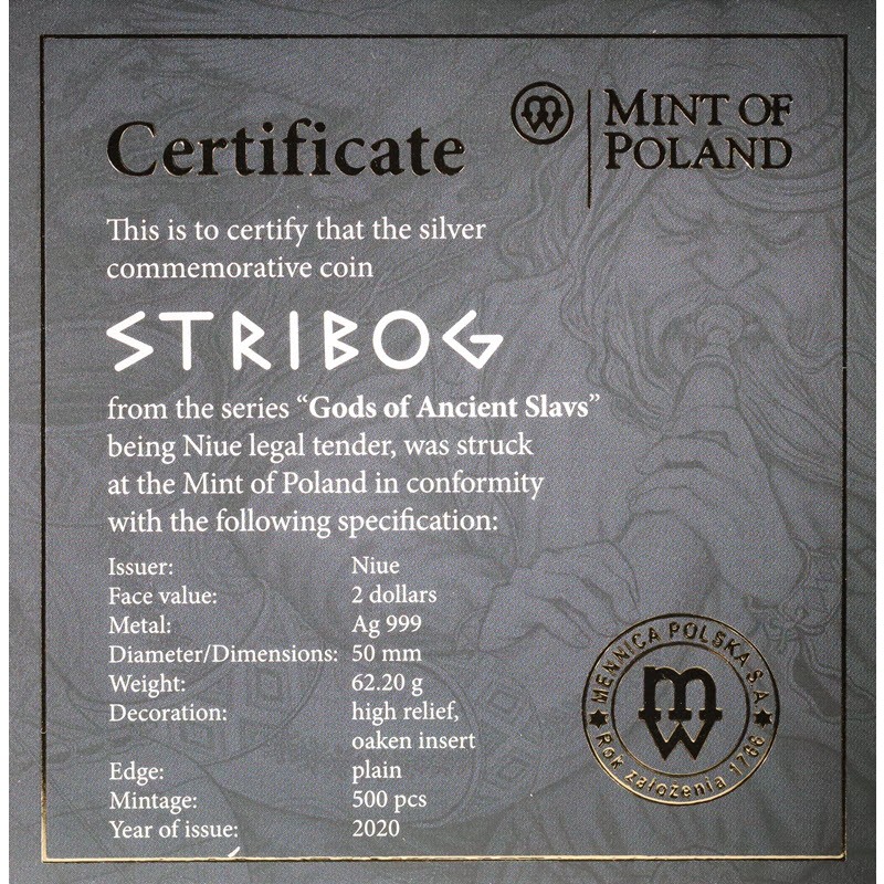 Серебряная монета из серии «Славянские боги», посвященная славянскому богу ветров. Монета изготовлена в античном стиле. Ограниченный тираж.