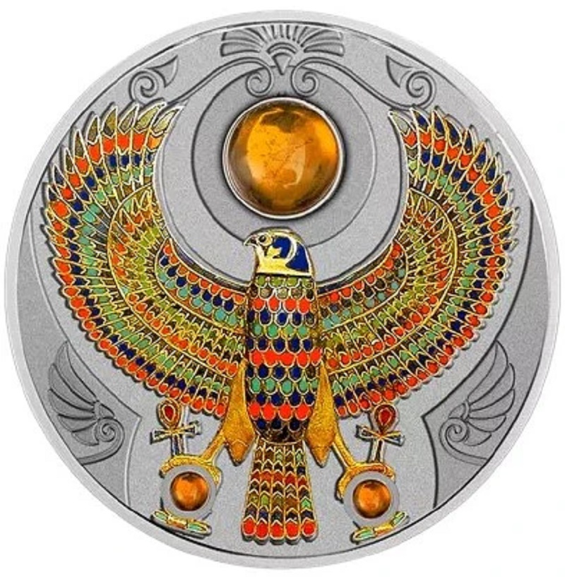 Серебряная монета весом 2 тройские унции, украшенная янтарем, посвящена Соколу Тутанхамона - амулету, обнаруженному в гробнице Тутанхамона. Ограниченный тираж - 999 штук.