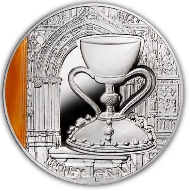 Серебряная монета из серии «Тайны истории», посвященная Святому Граалю. Монета представлена в футляре с сертификатом подлинности.