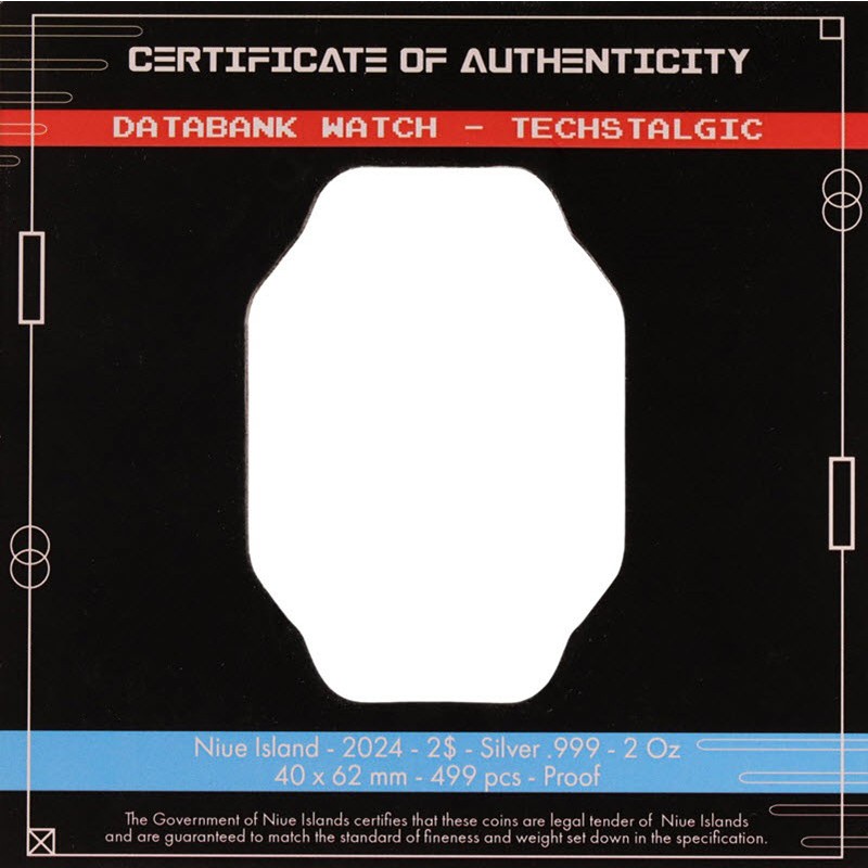 Эта удивительная серебряная монета весом в 2 унции посвящена знаменитым часам Databank Watch размером 40 Х 62 мм. Она вторая из серии «TechStalgic», которая прославляет пересечение цифровых технологий 80-90 годов и ностальгии. У нее качество пруф. Поставляется в футляре с сертификатом подлинности. Тираж: 499 штук.