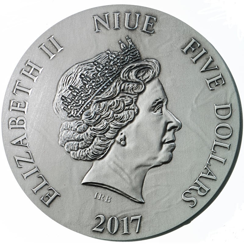 На аверсе изображена королева Елизавета II в бриллиантовой тиаре. Под портретом королевы инициалы дизайнера IRB (Ian Rank Broadley). Вдоль канта надпись: ELIZABETH II NIUE FIVE DOLLARS 2017 (Елизавета II, страна-эмитент, номинал, год чеканки).