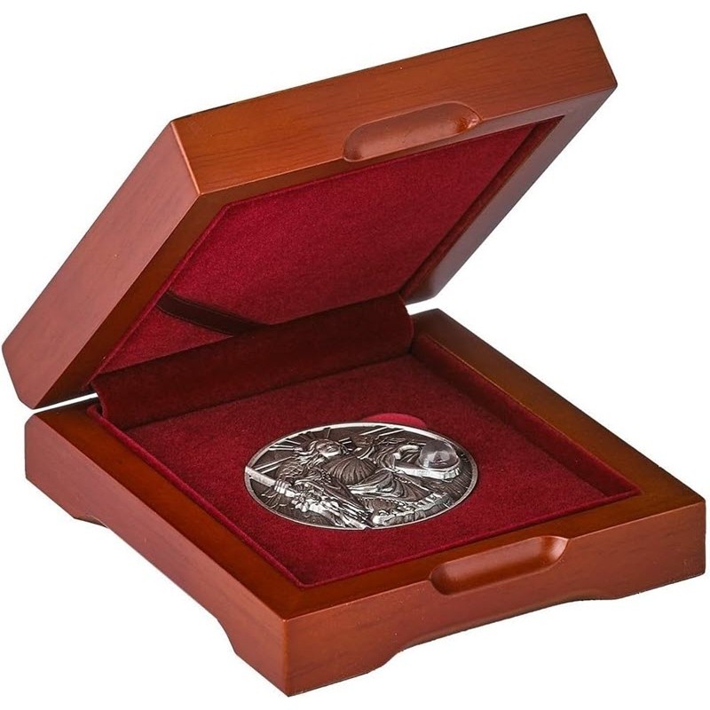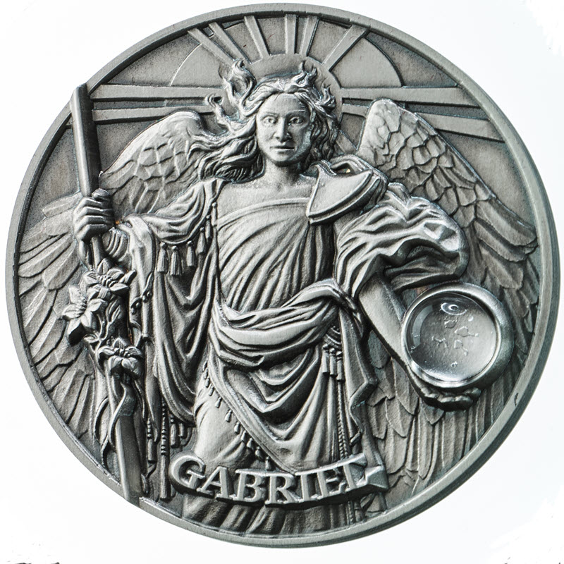 Эта замечательная серебряная монета весом в 2 унции – вторая из серии «Хор ангелов» - посвящена архангелу Гавриилу. У нее высокий рельеф, качество античной отделки и вставка из зелёного авантюрина. Поставляется в футляре с сертификатом подлинности. Тираж: 1000 штук.