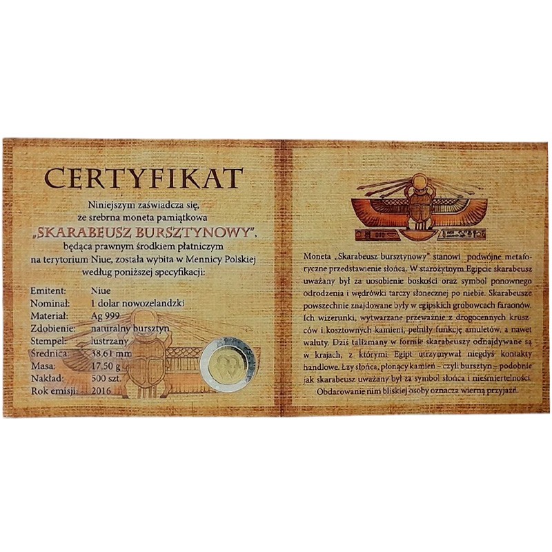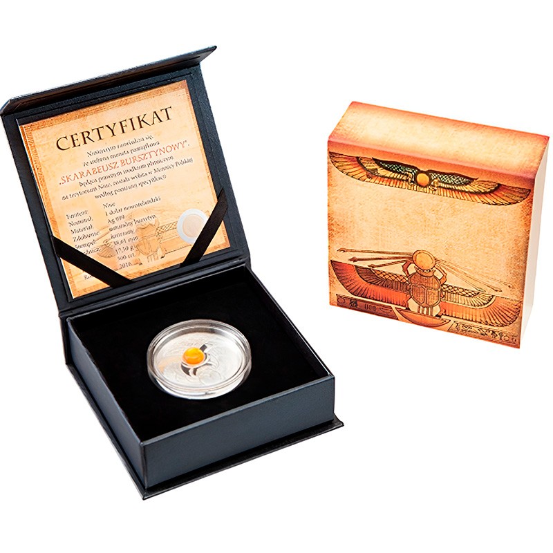 Дизайн этой чудесной серебряной монеты Польского монетного двора вдохновлен древнеегипетской мифологией, в которой жук-скарабей ассоциируется с возрождением и вечной жизнью. В центре монеты находится вставка из янтаря, которая символизирует солнце и его жизненную силу. Древние египтяне верили, что жук-скарабей катит солнечный диск по небу.