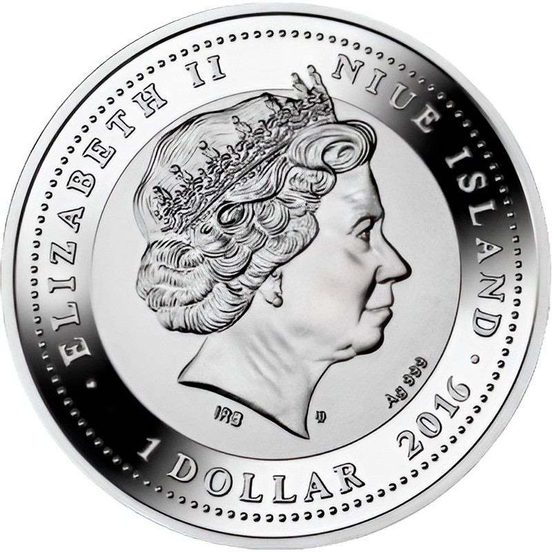В центре - портрет Ее Величества Королевы Елизаветы II дизайнера Яна Рэнка-Бродли, монограмма Польского монетного двора (m/w), проба серебра (Ag 999). Вдоль канта надписи: ELIZABETH II NIUE ISLAND ∙ 1 DOLLAR 2016 ∙ (Елизавета II, страна-эмитент, номинал, год чеканки).