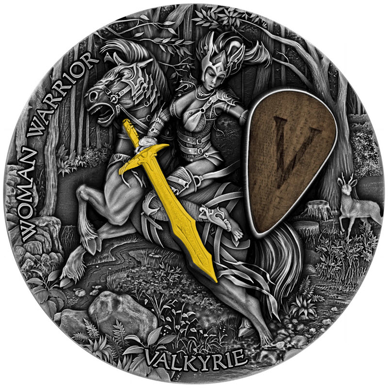 Серебряная монета Ниуэ - вторая из серии «Женщины-воины» - посвящена валькириям. У нее качество античной отделки, высокий рельеф, выборочное золочение и деревянная вставка. Поставляется в оригинальном футляре с сертификатом подлинности. Тираж: 555 штук.