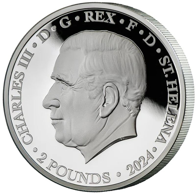 На аверсе портрет Чарльза III работы Глина Дэвиса. На срезе шеи инициалы дизайнера GD (Glyn Davies). Вокруг портрета надпись: CHARLES III · D · G · REX · F · D · ST. HELENA · 2024 · 2 POUNDS · (Чарльз III, божьей милостью, король, защитник веры, страна-эмитент, год чеканки, номинал).