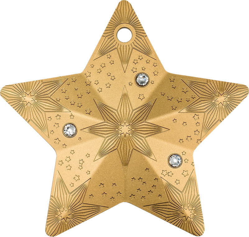 Эта красивая серебряная монета весом в 1 унцию имеет форму звезды и сделана в виде кулона, идеально подходящим для вашей рождественской ёлки! У нее качество античной отделки, выборочное золочение, высокий рельеф и кристаллические вставки. Поставляется в футляре с сертификатом подлинности. Тираж: 750 штук.