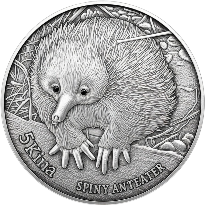 Изображение колючего муравьеда на фоне травы и камней, глаза которого инкрустированы двумя черными бриллиантами (диаметром около 1 мм). Внизу указан номинал - 5 Kina и название животного - SPINY ANTEATER (Колючий муравьед)
