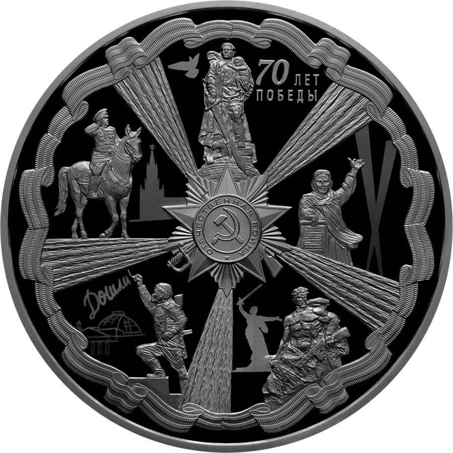 В центре – рельефное изображение Ордена Отечественной Войны с пятью радиально расходящимися от него лучами, в образованных ими секторах: вверху – Памятник Воину-освободителю в берлинском Трептов-парке, надпись: "70 ЛЕТ ПОБЕДЫ" и летящий голубь, справа – фрагмент плаката "Родина-мать зовет", внизу справа – монументы "Стоявшим насмерть" и "Родина-мать зовет" на Мамаевом кургане в Волгограде, внизу слева – фигура советского солдата, наносящего надпись на стену рейхстага, слева – маршал Жуков на коне, принимающий парад на Красной площади, вдоль канта – кольцо из Георгиевской ленты.