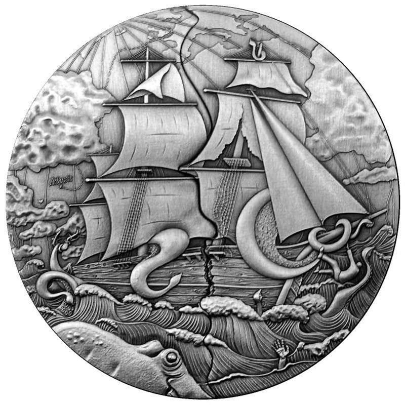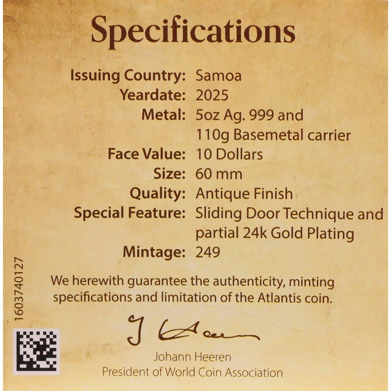 Эта фантастическая серебряная монета посвящена мифической Атлантиде и демонстрирует технику раздвижной двери! На верхнем слое с обеих сторон раздвижной двери нанесено изображение парусника в бушующем океане. Открыв их, вы увидите второй дизайн Атлантиды с частичным покрытием из 24-каратного золота. У неё вес 5 унций серебра и 110 грамм недрагоценного металла, качество античной отделки и выборочное золочение. Поставляется в оригинальном футляре с сертификатом подлинности. Тираж: 249 штук.