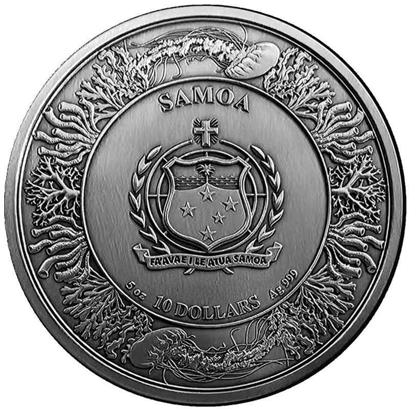 На аверсе изображен герб Самоа. Вокруг герба надпись: SAMOA 5 oz 10 DOLLARS Ag 999 (страна-эмитент, вес и проба серебра, номинал). Вдоль канта образы кораллов и медуз.