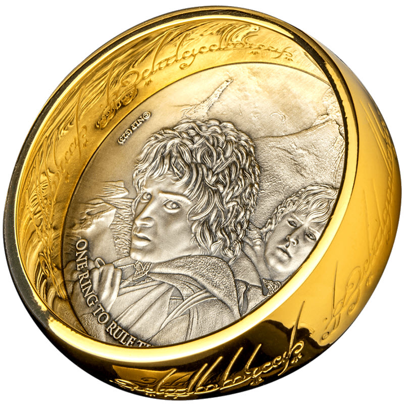 Эта красивая серебряная монета весом 3 унции посвящена известному фильму "Властелин колец" и изображает репродукцию Единого кольца. Монета имеет античную отделку и покрыта 24-каратным золотом, кант кольца в формате 3D с качеством Proof. Ограниченный тираж 1.499 штук по всему миру!