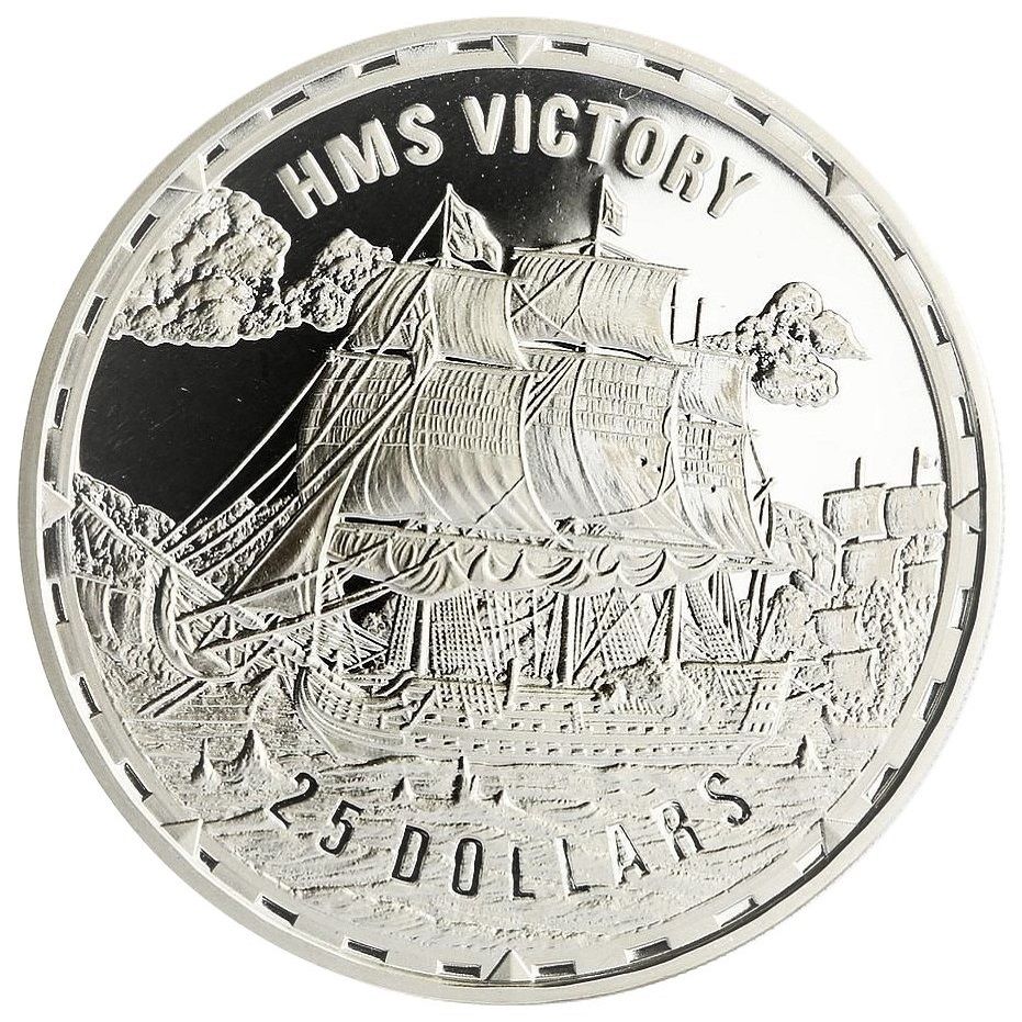 Изображение HMS Victory на всех парусах. Сверху название корабля — HMS VICTORY, внизу номинал — 25 DOLLARS.
